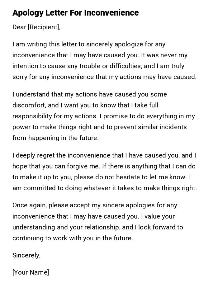 I am writing this letter to sincerely apologize for any inconvenience that I may have caused you. It was never my intention to cause any trouble or difficulties, and I am truly sorry for any inconvenience that my actions may have caused.