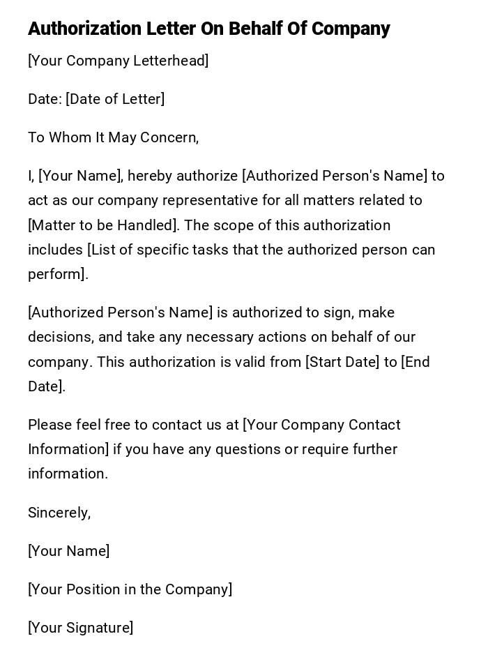 I, [Your Name], hereby authorize [Authorized Person's Name] to act as our company representative for all matters related to [Matter to be Handled]. The scope of this authorization includes [List of specific tasks that the authorized person can perform].