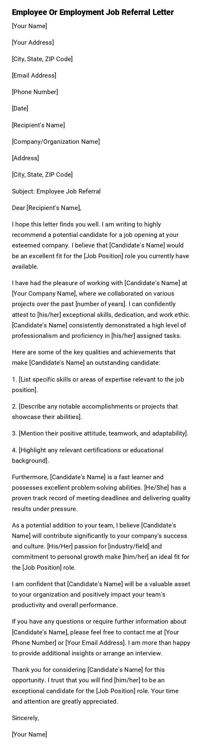 - A job referral letter is a formal or informal recommendation from an employee, colleague, or acquaintance to help a candidate secure a job.