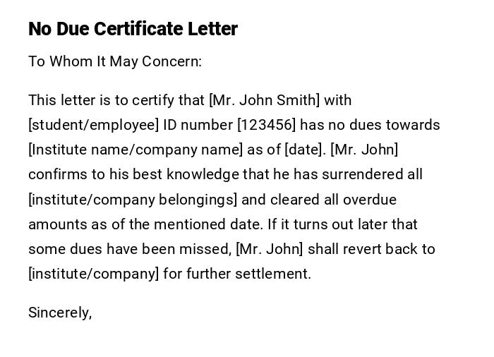 This letter is to certify that [Mr. John Smith] with [student/employee] ID number [123456] has no dues towards [Institute name/company name] as of [date]. [Mr. John] confirms to his best knowledge that he has surrendered all [institute/company belongings] and cleared all overdue amounts as of the mentioned date. If it turns out later that some dues have been missed, [Mr. John] shall revert back to [institute/company] for further settlement.