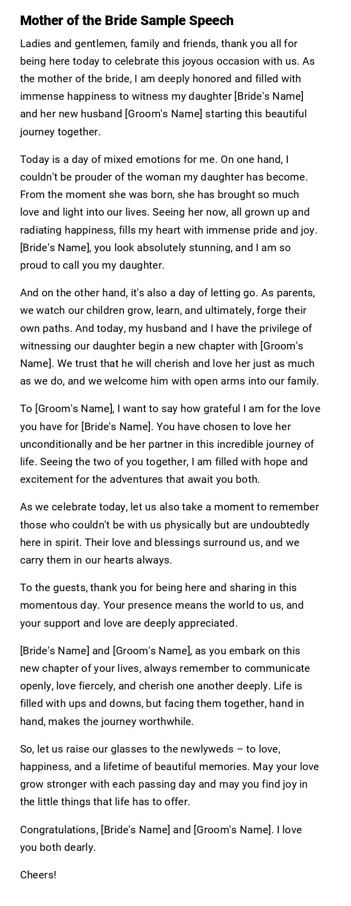 Ladies and gentlemen, family and friends, thank you all for being here today to celebrate this joyous occasion with us. As the mother of the bride, I am deeply honored and filled with immense happiness to witness my daughter [Bride's Name] and her new husband [Groom's Name] starting this beautiful journey together.