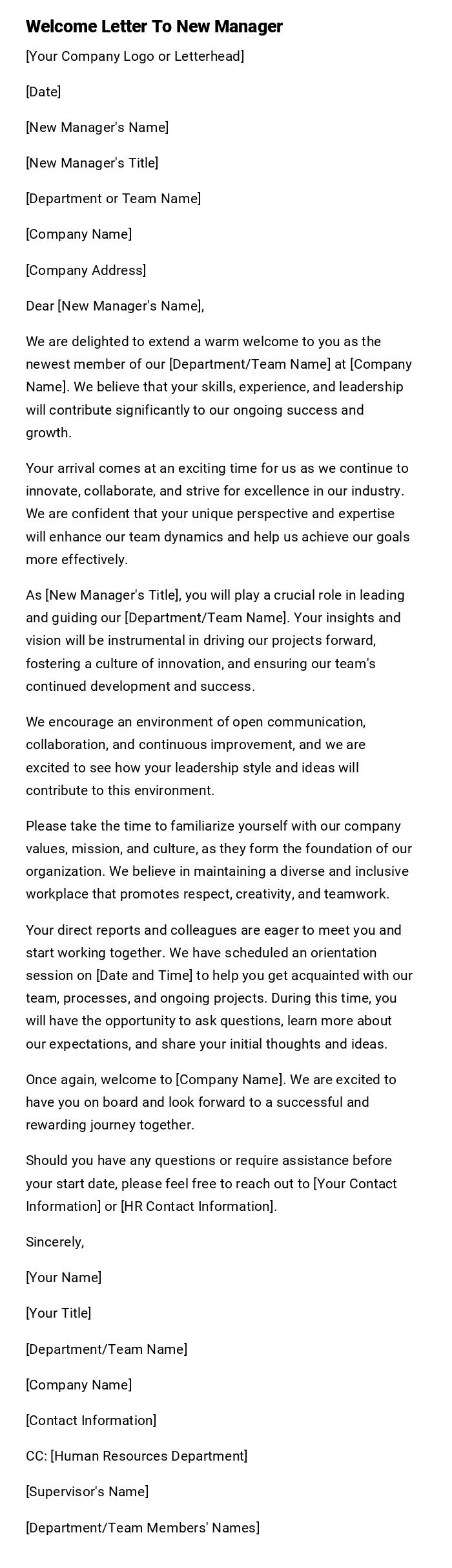 As [New Manager's Title], you will play a crucial role in leading and guiding our [Department/Team Name]. Your insights and vision will be instrumental in driving our projects forward, fostering a culture of innovation, and ensuring our team's continued development and success.